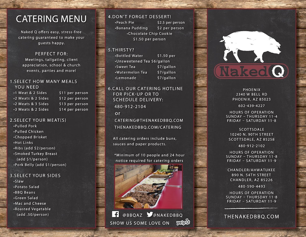 The menu at NakedQ BBQ in Phoenix offers a variety of traditional barbecue dishes, structured into several key categories to suit different dining preferences. The main food items include smoked meats such as St. Louis Style Ribs, pulled pork, pulled chicken, jalapeño hot link sandwiches, and chopped brisket sandwiches. These items are often served with a choice of sides, providing options for both individual sandwiches and larger platters.