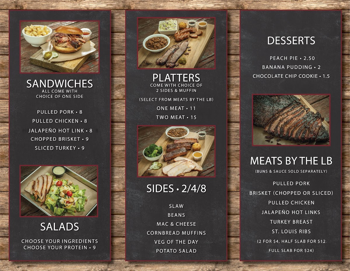 Overall, the menu is suited for casual dining occasions, ranging from quick orders of sandwiches to more complete meals with multiple meats and sides.